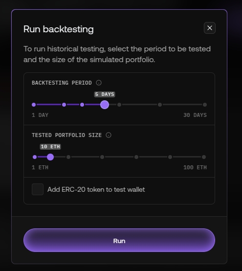 Run the Backtest: Click "Run" to simulate your agent’s trades during the selected period.